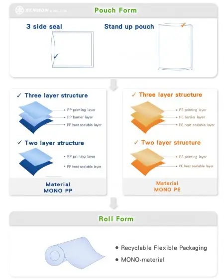 - Mono PE is also a high-barrier, fully recyclable flexible packaging material composed of 100% recyclable materials. With a heat resistance of up to 95°C, it provides excellent cold resistance, making it ideal for frozen food packaging.