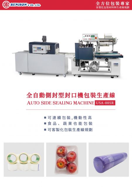 侧封式封口包装机是L式封口机的进阶设备,其使用圆滚式封刀设计,让包装更稳定,也能够连续进行包装,大幅增加包装速度,相当适合产量高,且产品多样化的公司,尤其是长度较长的产品也能轻松包装(当产品宽度差异不大时,可直接在同一条产线进行包装)。