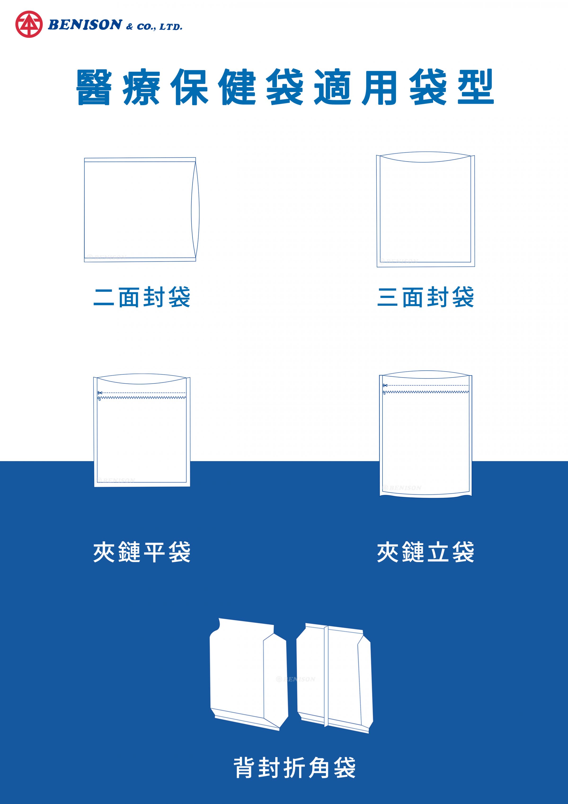 二面封袋、三封袋、夾鏈平袋、夾鏈立袋、背封折腰袋
